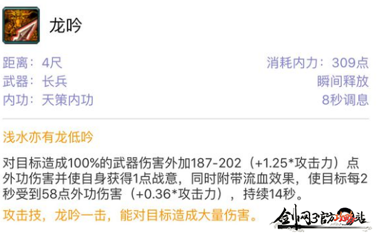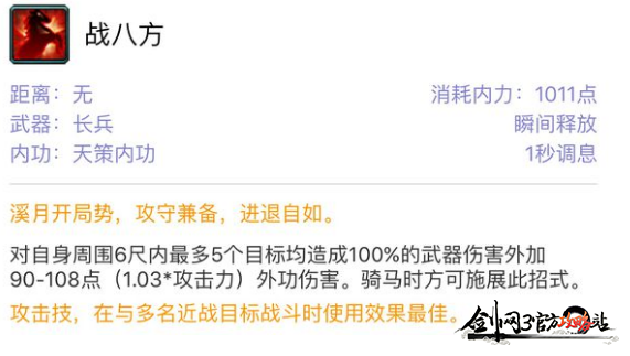 它的战略意义和龙吟一样,但是需要第十一重奇穴【牙璋】的支持才能有流血的效果,同时需要第五重奇穴【出云】的支持才能在马下施展。与龙吟不同的是,战八方不需要目标锁定,好了就用就可以,正所谓经济又实惠,方便又好用,多抡战八方总是没错的。
