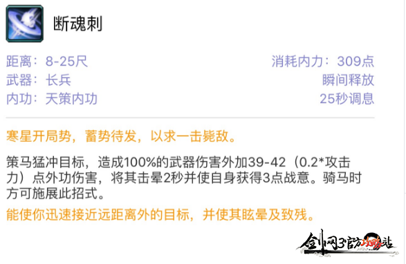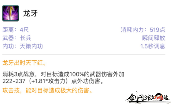 2.断魂刺过后你会获得3点战意,一般都是我们都会选择用这三点战意去踩人(使用破坚阵),但是特殊情况下我们可以利用这三点战意直接打龙牙。比如敌人差一刀死,你又正好上马,不要犹豫,直接断魂刺过去打龙牙。