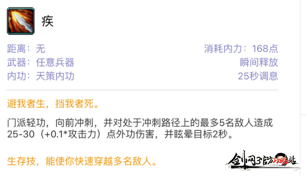 为什么天策害怕封轻功?因为封轻功就用不了疾。疾是剑三中最远距离的位移技能,用不了疾就等于砍了天策半条腿(另半条腿是马)。所以天策特别要注意学会如何应对封轻功,这属于进阶内容,这里不讲。