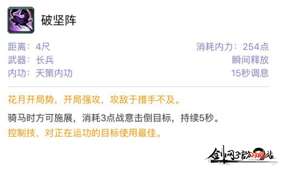破坚阵:三本减cd。有同学会疑惑破坚阵秘籍里的【招式效果】叫做“绕足”是什么意思?答:踩倒后使敌方减速,没有卵用。因为一旦你踩倒了对方,那么他就倒地不能动了,所以减速没有意义。如果他交了解控起,那么解控技能在解除击倒的同时也会解除减速,所以减速还是没有意义。