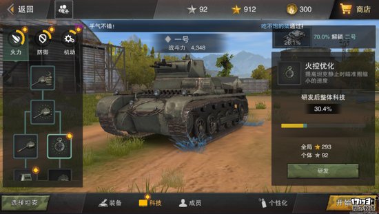 说起游戏中的坦克养成自然是无法回避的问题,好在游戏的坦克入手方式并非“十连抽”而是采用了攀升科技的设定,游戏中以德国、苏军以及盟军三个阵营的坦克线作为发展方向,随着科技研发进度的提升不仅仅提高你的坦克战斗能力,同时还会解锁下一阶级的坦克,即玩家在强化坦克的同时就能够轻松的解锁更高级的坦克,并且这些坦克的类型又划分为轻型、中型、重型坦克三种,每种坦克所具有的战略优势对于各位军迷玩家来说想必是再熟悉不过的。