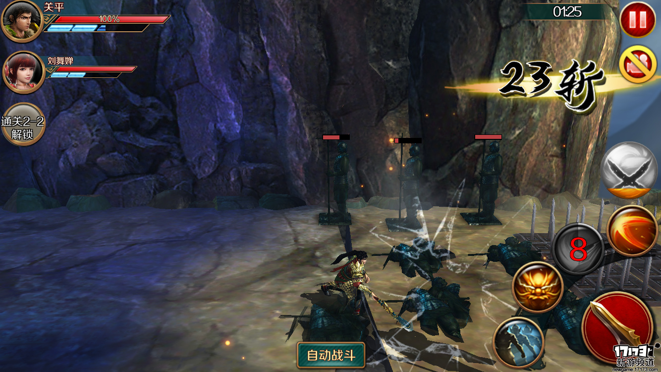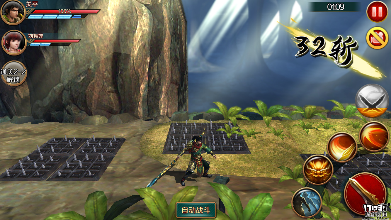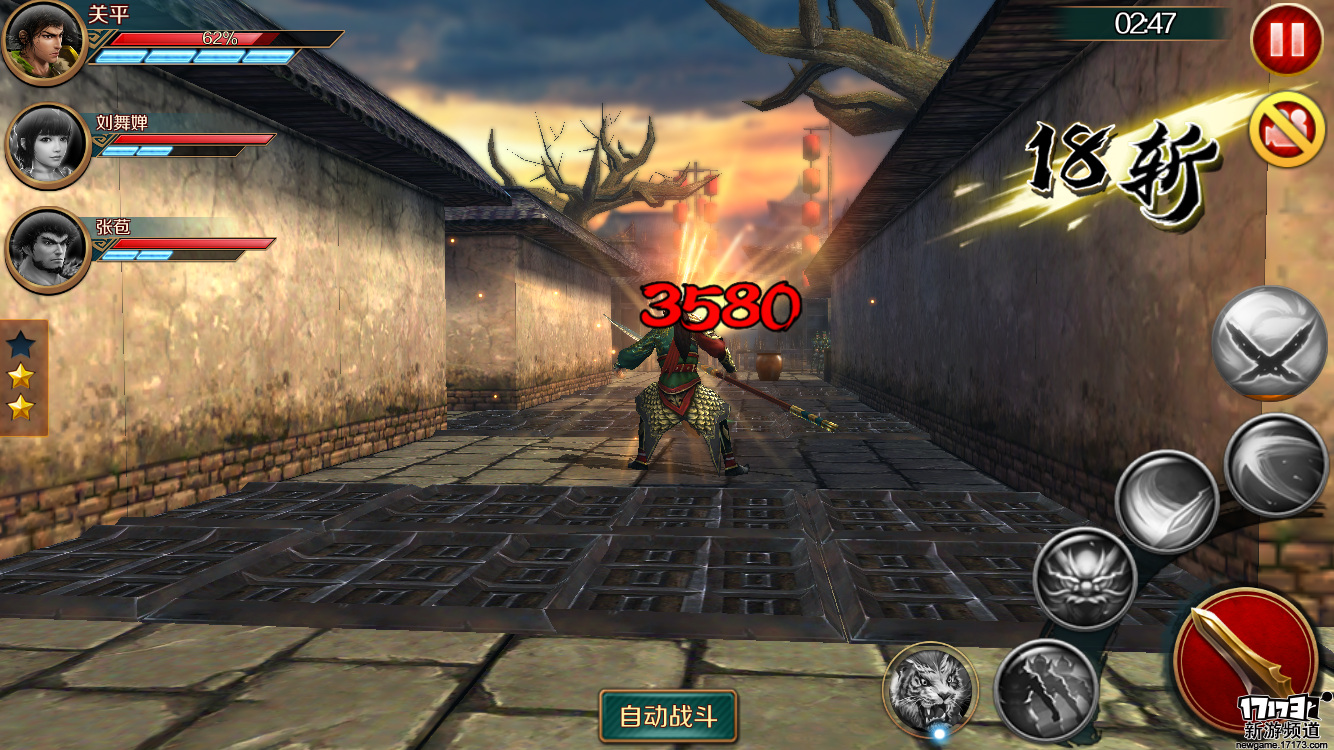 在战斗的过程中,角色的技能条将会随着普通攻击不断的累积,玩家施放技能以及使用闪避反防等技能虽然没有冷却时间但是需要耗费能量条,所以在战斗的过程中如何选择分配技能的使用就成为的玩家操作的关键。前面我们所说到的反防技能是根据游戏中玩家选择的角色不同而有着不同的设定,如关平有着闪避技能,而张苞却是架招反击甚至在画面上还有个大写的“喝”。至于无双技能与《三国无双》一样在积累到满值时能够让角色施放出一次强力的无双连舞对敌人造成高额的伤害。