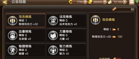 目前公会技能共有6个技能,分别是攻击修炼(增加物理攻击力)、法攻修炼(增加法术攻击力)、血量修炼(增加生命值)、力量修炼(增加力量)、敏捷修炼(增加敏捷)和智力修炼(增加智力)。