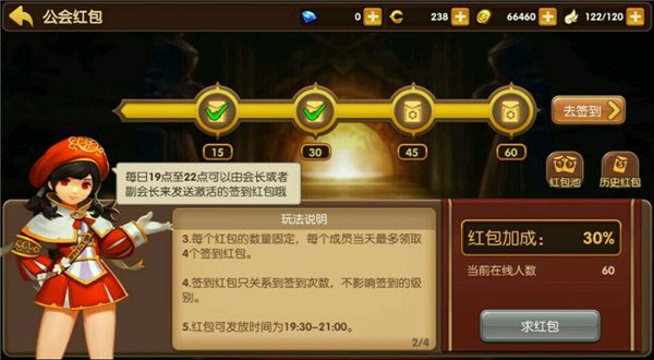 在公会中,只有只有会长和副会长才有资格发放红包,普通成员是无法进行发放的,。作为会长和副会长在发放时要提前通知公会成员上线,因为红包的大小可是根据公会玩家在线人数决定的,在线的人数越多,红包的总体奖励就越多,同时这样也可以让更多的人拿到红包哦。不过基础的签到红包每人得到的数量是固定的,每天玩家只能最多领取4个签到红包,红包发放的时间在19:30-22:00这个时间各位一定要牢记哦。