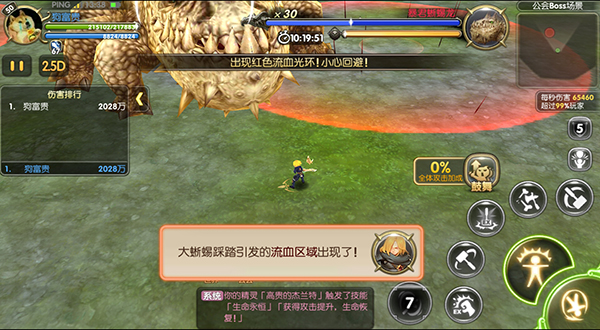 还有一点就是公会BOSS的技能问题,公会BOSS是不变的,一直是一只巨大的地龙。等级提升技能也不会改变,一个是翻滚。玩家在看到地龙四脚朝上时就应该停止攻击,敢看进行躲避。地龙的翻滚是成直线的所以不要担心躲在一旁还会受到波及。二个就是大范围的流血区域,这个区域就不要长时间站在里面了,持续掉血掉的非常的厉害。可以说这是地龙攻击最强的技能虽然不是爆发,但是胜在持续。大家切记一定要远离地上红圈的范围。