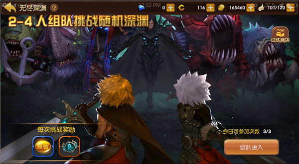 每日可双人到四人组队挑战随机深渊关卡,每天可以参加三次挑战。次日重置挑战次数。