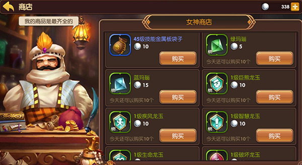 除了45级的技能金属板袋子没有兑换限制以外,其他的绿玛瑙、蓝玛瑙以及各种1级龙玉都是有每日购买限制,10次限购肯定是够用了!也没有哪个欧洲人的欧气冲天可以一天能出110个女神的眼泪!