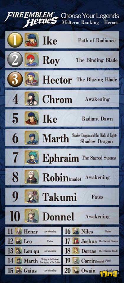 火焰纹章英雄中有大量的系列经典角色,实际上火焰纹章英雄在开服之前已经经过了一轮人气投票,投选出了大家最喜欢的角色,一起来看一下吧。