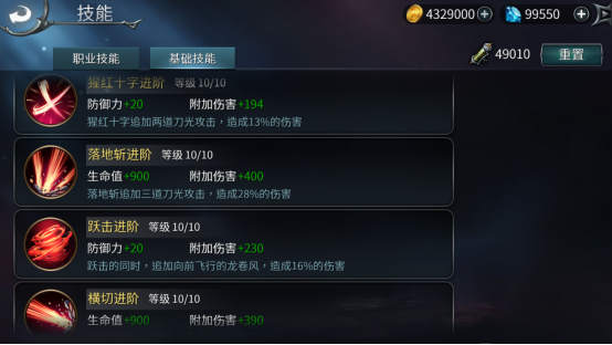 曙剑的基础技能有猩红十字进阶、落地斩进阶、跃击进阶、横切进阶四种,需要玩到一定的关卡才逐步开启,最高可以强化到10级。这些技能都是从对初始技能的强化,辅助英雄在出征途中提高伤害值。