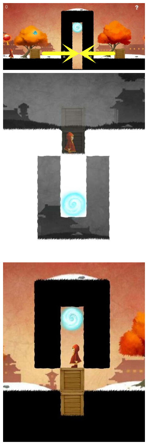 这样玩家从阳性空间,进入阴性空间之后,原先空白的沟壑,成了一座小山,原先的小山阻碍,成了一片空白(见上图),如此就能到达原先不可能到达的地方。除了要学会使用沙漏来颠覆世界方向找到碎片外,还需要借助场景中的箱子、弹石等机关来顺利进入时空隧道。