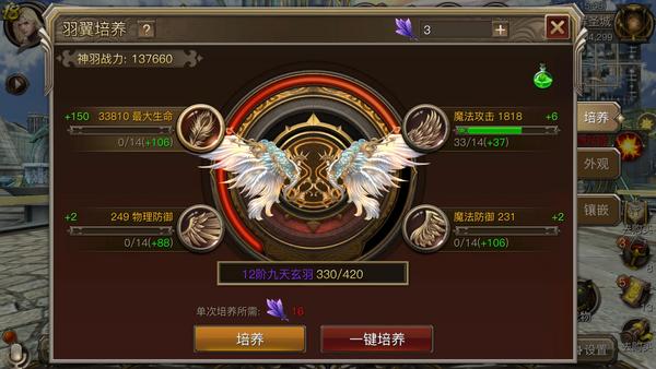 当羽翼的培养值都达到上限时,羽翼会自动进阶,进阶后会提高各项属性的培养上限。进阶到一定等级,玩家将会获得新的羽翼外观。