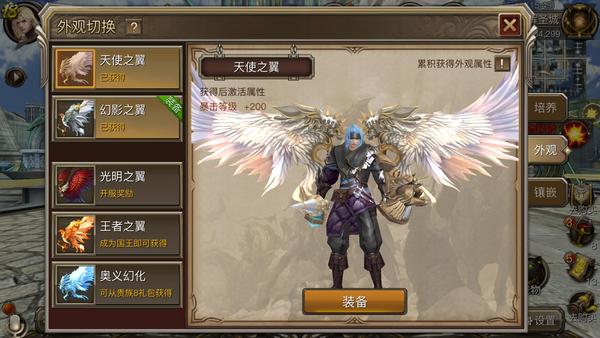 羽翼外观可以通过羽翼进阶、商城购买或是完成特定的活动获得,幻化后可以激活羽翼的幻化属性。玩家可以通过点击“查看总加成”显示目前装备神羽所加的详细属性。