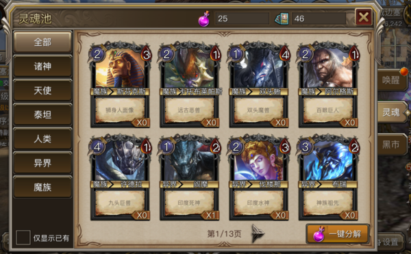 黑市:在诸神试炼中完成任务可获得灵魂粉末,在黑市中可使用灵魂粉末兑换相应的卡牌。