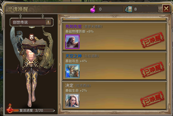 二、神灵组合:神灵除了可以单张唤醒激活属性外,还可组合唤醒,组队唤醒对战力的提升效果更佳。在唤醒的神灵中,品质越高的神灵能够组合的方式越多。