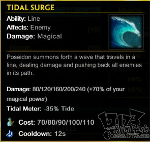 波塞冬聚集一道汹涌波浪向前方涌动,对途经敌人造成80/120/160/200/240点伤害(附加70%法术强度伤害),并击退敌人。该技能会降低35%的潮汐等级。