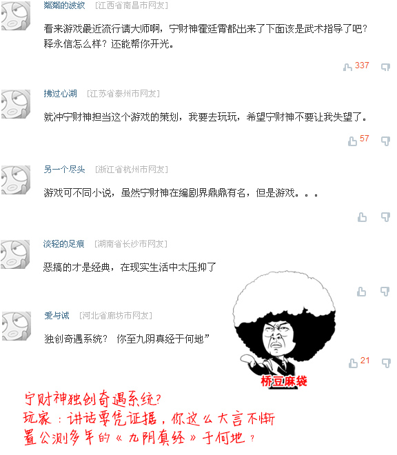 厂商似乎越来越热衷请网络畅销小说作家、或者电视编剧做“游戏剧情架构师”,前有江南、南派三叔与网游合作,近日巨人旗下一款2D武侠《江湖》也邀请宁财神做剧情,据说,宁财神除了创作《龙门镖局2》和录制《非常勿扰》,时间几乎全部奉献给了《江湖》,连续两年被评为“巨人网络年度优秀员工”。巨人称游戏中最好玩的“奇遇系统”就是出自宁财神之手(新闻>>)。