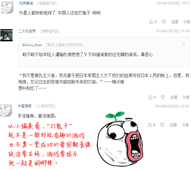 “‘打鬼子’去吧!”继推出名为“打贪官”的游戏后,人民网微博平台再度“出招”,又推出了新的主题游戏:打鬼子。小编体验了下,感觉不好玩,你们也可以去感受下(传送门>>)。