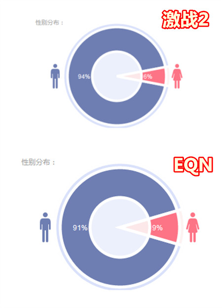 这个结果看似出人意料,但实际上又在情理之中,因为《激战2》的核心玩法是杀戮与战斗,EQN是冒险养成。妹子都是害怕战斗,拒绝杀戮的和平人士,所以你们懂的。