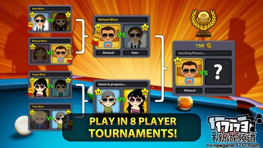 来自MiniClip的一款台球类竞技游戏,比较厉害的是可以多人进行对战,争夺最后的冠军,这类游戏算是比较少见。游戏采用的是美式普尔(8球)台球的规则。