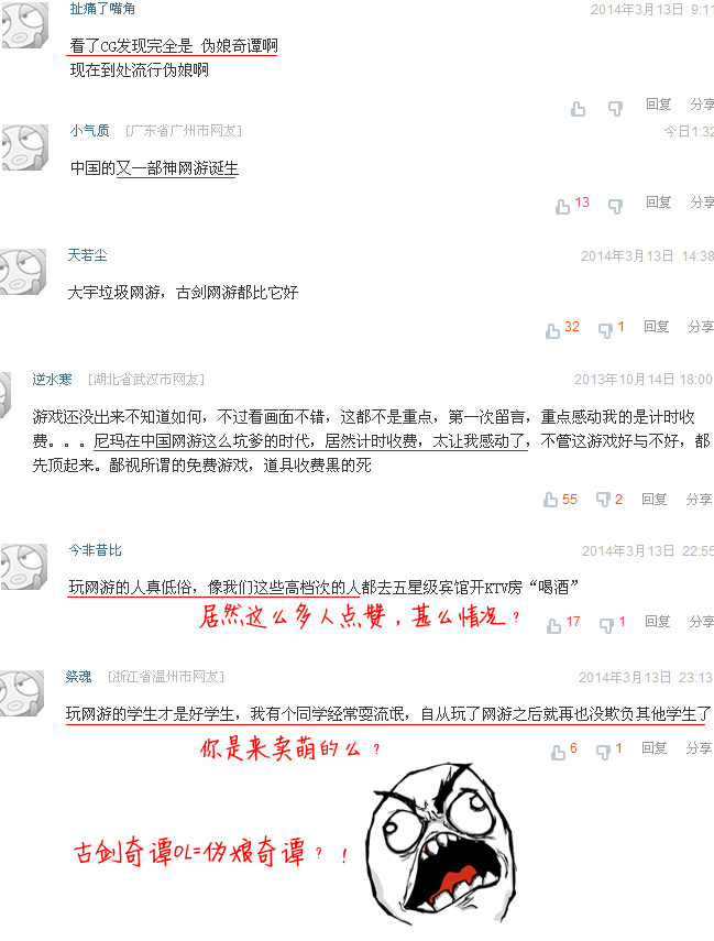 本周“神评论”内容不多,一周一期竟然才攒了这么点内容,小编偷懒扣工资!冤枉啊,小编已经很努力给大家筛选有意思、有态度、有观点的评论了,想必大家也是知道的,现在五毛制霸“托”横行,另外还有N多打小广告的、开口就喷的、互相人身攻击谩骂的...,没办法,网络环境太糟糕,想要找点智慧的闪光点,简直堪比拿着放大镜寻宝啊! 另:小编有意增加对特定游戏的评论板块,比如,想知道《最终幻想14》这款游戏值不值得玩?小编会总结群众的意见给大家。 对栏目有建议或对某款游戏有需求,欢迎下方留言。