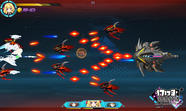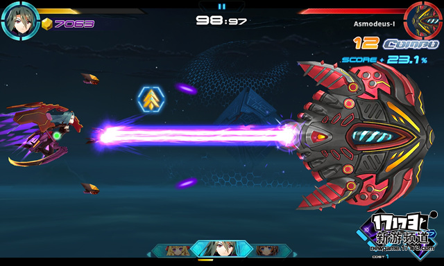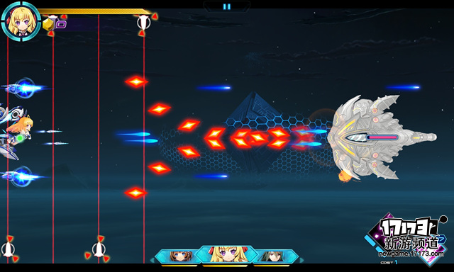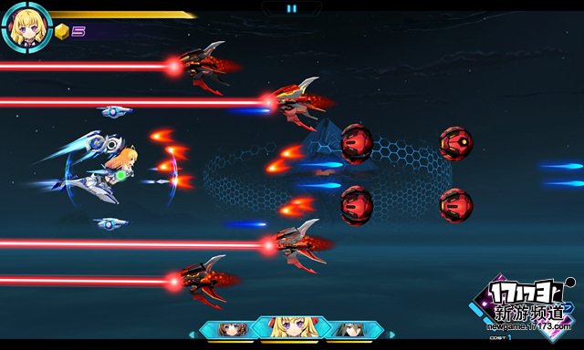 正如以往飞行射击游戏中常用的炸弹键一般,游戏中的角色还有着各式各样的技能,其作用除了伤害输出外,莫过于在你危难之时清空全屏幕的弹幕化解你的危机,至于人物技能时的特写镜头大家只管欣赏吧。值得一提的是,在战斗中玩家能够上阵三名角色,可由玩家手动切换或是当前角色死亡后自动上场,既降低加了关卡挑战的难度,又增加了游戏的乐趣。