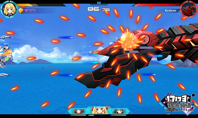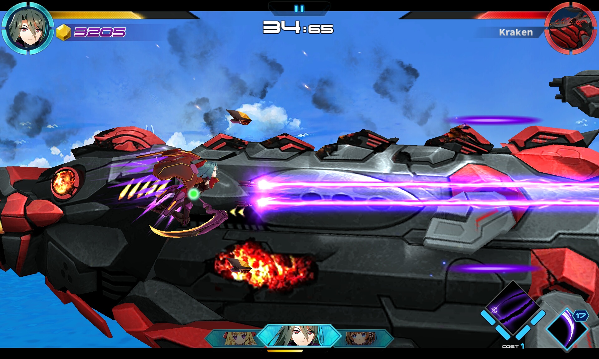 正如以往飞行射击游戏中常用的炸弹键一般,游戏中的角色还有着各式各样的技能,其作用除了伤害输出外,莫过于在你危难之时清空全屏幕的弹幕化解你的危机,至于人物技能时的特写镜头大家只管欣赏吧。值得一提的是,在战斗中玩家能够上阵三名角色,可由玩家手动切换或是当前角色死亡后自动上场,既降低加了关卡挑战的难度,又增加了游戏的乐趣。