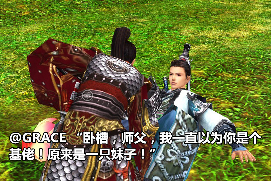 @GRACE 我是女汉子,但我喜欢勾搭妹子的感觉!在剑网3里我塑造了一个外表很憨,内心和温柔的大叔形象,还收了男徒弟,一起打战场打攻防。直到有一天我们上了YY,他才吓了一大跳:“卧槽,我一直以为你是个基佬(声音暴露了我)”