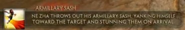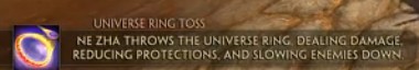哪吒向前方抛掷混天绫,对命中的第一个敌人造成晕眩效果,并将哪吒拉向目标。在哪吒到达目标后,对于附近敌人造成伤害。