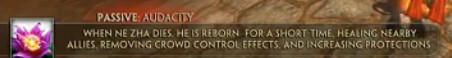 当哪吒死亡后,他不屈意志化身为一朵莲花,治疗附近的队友并增加护甲。哪吒使用四瓣铁链进行普通攻击,最后一击对前方所有敌人造成伤害。