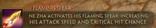 哪吒为其红缨枪注入其战斗意志,点燃武器后一段时间内提高攻击速度和暴击率。