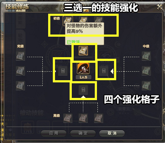 《天谕》每个职业的技能不多,满级后有4个可以强化的格子,每个格子有三个强化方向作为备选项。这种模式能够让玩家有一些自由度,比如有的人喜欢追求高伤害,有的追求减CD,各取所需。