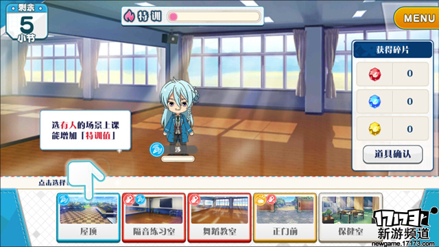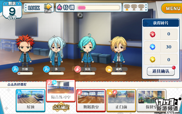 游戏在玩法上虽然有集成音乐玩法但是并非以音游为核心,游戏中的关卡设计还是以游戏的剧情为核心,玩家要通过上课来增加角色的属性,在上课的过程中,玩家能够随意选择屋顶、隔音练习室、舞蹈教室、正门、保健室等各个区域来培养角色,每个区域都对应强化不同的角色属性,并且在强化的同时还会触发各种支线剧情,一般来说人越多的教室训练起来团队的提升则越多,倘若不小心走进没人的地区,那么还将触发特别事件,做对了选择的话能够提升LUCK的条目哦。