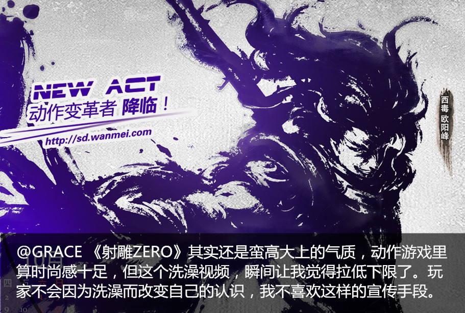 @GRACE 这个倒没什么,都是演戏而已。我觉得这个《射雕ZERO》这个黄蓉出浴的尺度实在是太大了,我是女汉子我都把持不住了!每次看你们用一些擦边球来宣传我就蛋疼,如果我有的话。《射雕ZERO》其实还是蛮高大上的气质,动作游戏里算时尚感十足,但这个洗澡视频,瞬间让我觉得拉低下限了。