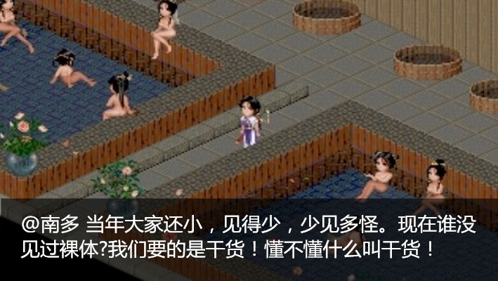 @南多 要说洗澡,其实中国厂商一直就有洗澡的习惯,从《仙剑奇侠传》开始就有了,李逍遥偷看赵灵儿洗澡,也是津津乐道的桥段。不过当年大家还小,见得少,少见多怪,现在谁没见过?各种打大擦边球的满天飞啊,我们要的是干货!懂不懂什么叫干货!