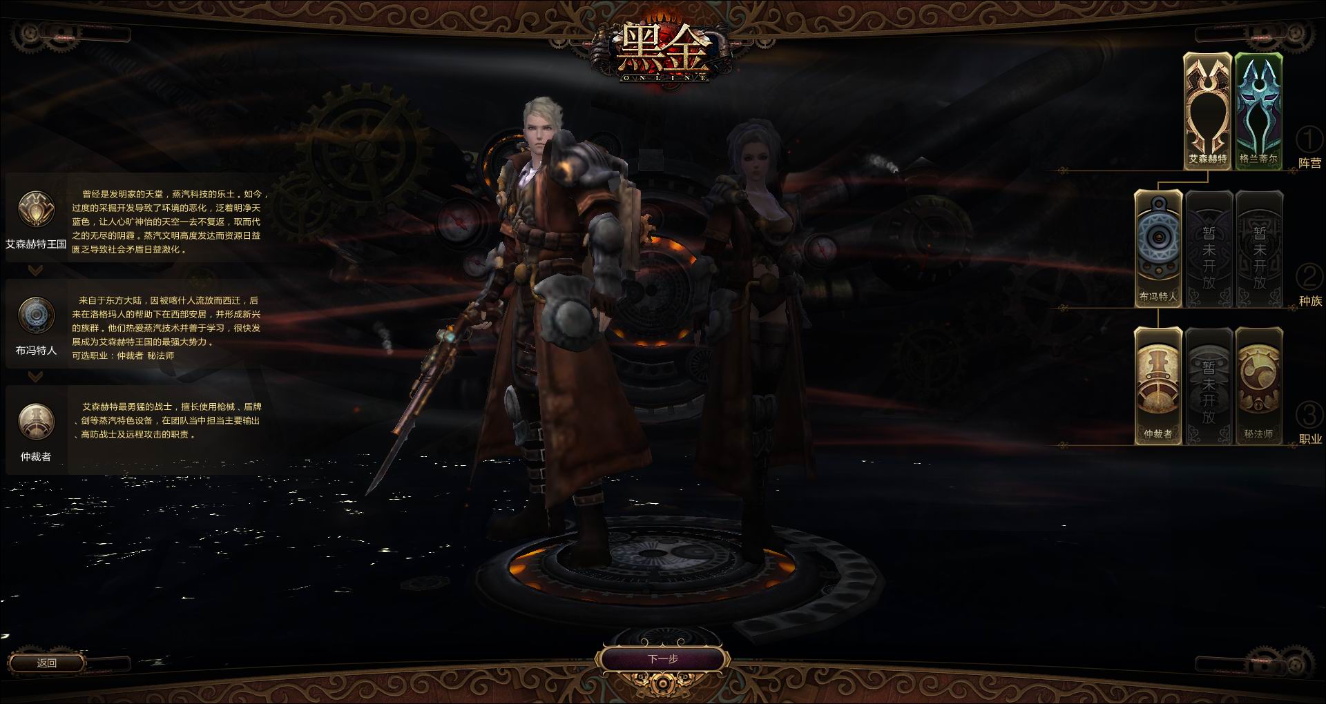 《黑金》讲述蒸汽和奇幻两大阵营冲突的故事,在游戏里职业与种族是挂钩的,每个种族分别对应了两个职业和相应的后续3个方向转职。