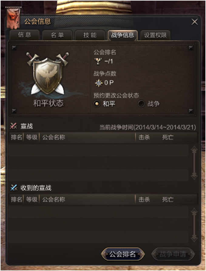 公会分和平状态和战争状态,和平状态下公会无法宣战或接受宣战。