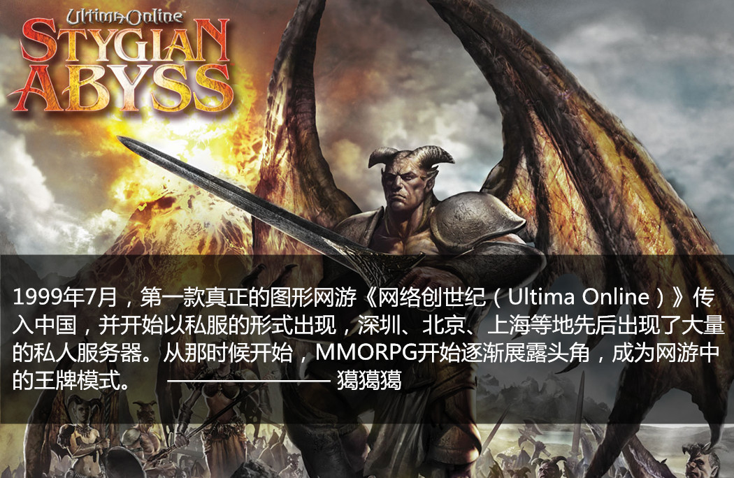 @獦獦獦 1999年当然要说起《*****》。我这里为大家普及一下吧:1999年7月,第一款真正的图形网游《*****(Ultima Online)》传入中国,并开始以私服的形式出现,深圳、北京、上海等地先后出现了大量的*****。从那时候开始,MMORPG开始逐渐展露头角,成为网游中的王牌模式。