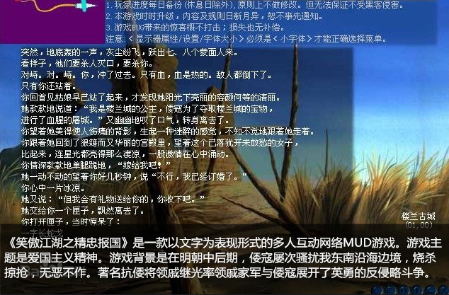 @阿鬼 99年老子还在电话拨号上网,那时候的网游没有死掉,能活到今天就不错了!再挑我就让你玩文字游戏去。比如1999年非常火爆的简易图形MUD游戏《笑傲江湖之精忠报国》,至于怎么玩我就不说了,我随便放几张图你们看看就懂了!
