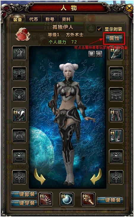 按下“C”键,会显示出人物界面,在界面的右上角点击“属性”按钮则会查看到个人属性: