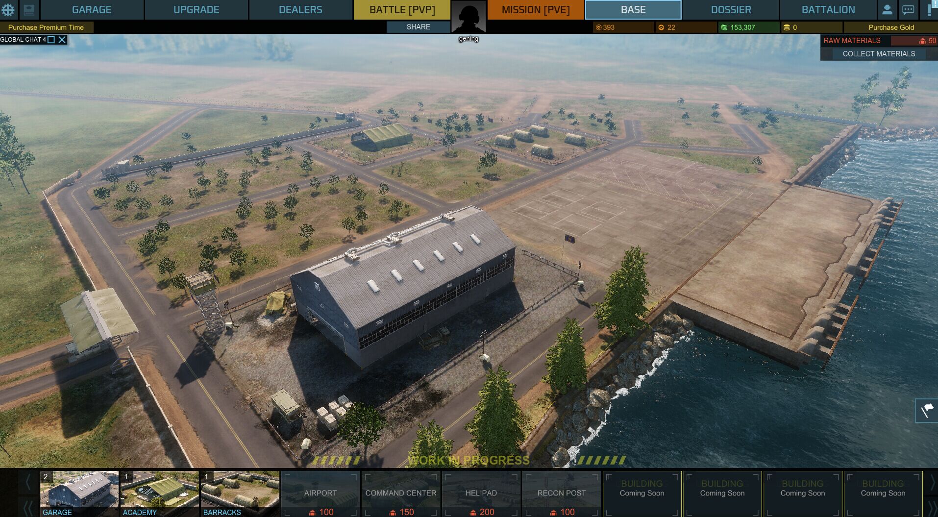 游戏中还加入了一个“基地养成”的模式。在这个模式中,玩家可以鸟瞰坦克的基地周边设施,通过战斗中的点数,用来强化或者建造设施,比如指挥官中心、停机坪、弹药库等等,这些设施会提升玩家的战斗经验获取效率,或者降低维修费用等等。但作用也仅此而已,并没有太多的可玩性。