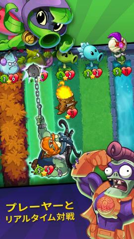 风靡全球的植物与僵尸的后花园大战又回来了。本次的战争已卡牌对战的方式展开。游戏采用了《植物大战僵尸》许多玩家耳熟能详的角色。打法上类似于《皇室战争》,游戏开始之后玩家与对手将分别列在屏幕的上下两侧,游戏中所有的单位将会以卡牌的形式出现,玩家直接拖动手牌即可将他们放置在场景中,当放置阶段结束之后,单位就会对敌人进行攻击,双方谁能活到最后就可以获得游戏的胜利。