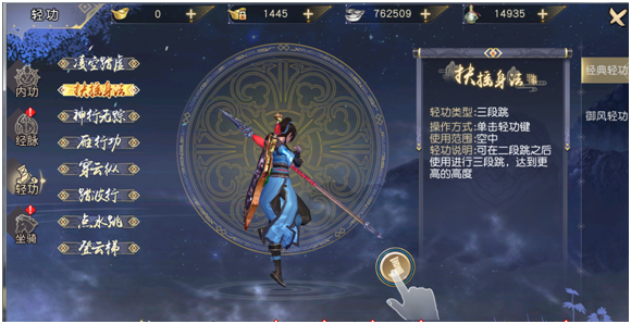 2、每种御风轻功都有不同的表现动作以及效果。游戏中目前有3种御风轻功,可以在游戏中的修炼-轻功界面进行查看