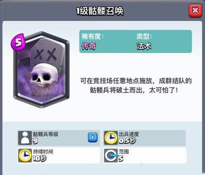 一级的骷髅召唤法术可以召唤20只9级的小骷髅,每0.5秒召唤一直,法术一共持续10秒,消耗四点圣水,可以在地图的任意位置释放,需要5阶竞技场才能解锁,为传奇卡牌。