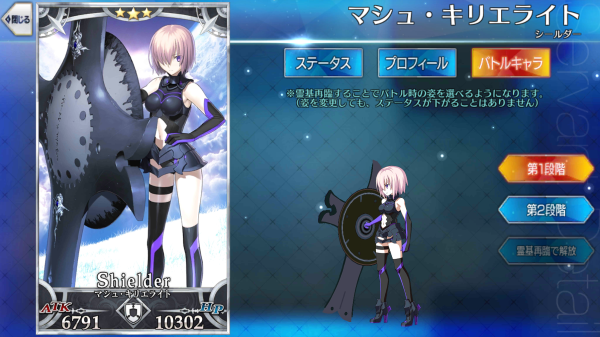 作为游戏固有的NPC从者,盾娘是唯一无需cost即可入队的从者,并且灵基再临完全跟着剧情进展不消耗玩家任何材料。盾娘的3个技能和宝具可以说都是保护队友的手段。