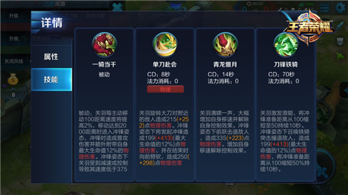 一骑当千(被动技能):关羽每移动一段距离都会提升自身移动速度,当移动速度达到2000时将改变普通攻击为冲刺。