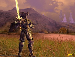 《Darkfall》的开发商挪威Razorwax公司再次放出了两张游戏截图,为玩家带来的是以前从未曝光的神龙套装。画面展现了精密的细节设计及图象引擎的强大动力。图中人类战士手持的利剑在夕阳下灼灼发亮,效果不俗的套装。