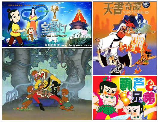 日韩动漫对于现在的年轻人已经非常熟悉了,但是对于中国美术片,只有在二十世纪七十年代和八十年代初出生的人在回味童年的时候才会想起。如图所示,这些人物造型都来自著名的中国美术片题材:《葫芦兄弟》《天书奇谭》《大闹天宫》《宝莲灯》。