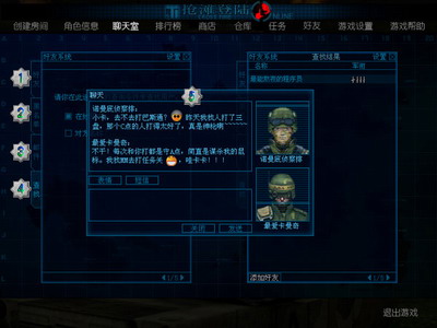 好友:好友列表黑名单:黑名单中玩家所有的聊天信息都会自动屏蔽掉。邮件:在好友不在线的时候,可以用邮件的方式给好友留言。查找:通过游戏ID进行模糊查找,可以很方便地找到游戏中的朋友。即时聊天:和单个玩家进行即时私人聊天。