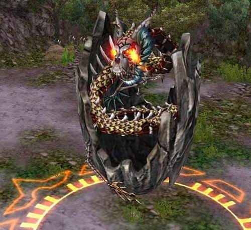 ▲被困在岩石中的骨龙,火红的眼睛中充满了怨恨。在它身上到底发生了什么样的故事呢?