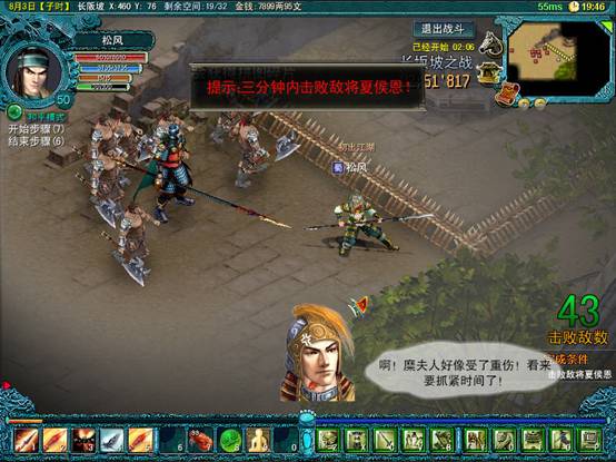 在战役任务中,玩家将依照系统提示,进入一个个相对独立的历史场景,这个场景可能是长坂坡子龙救主,也可能是博望坡火烧曹军,多到数不清的精彩场景任凭玩家选择。在进入该战役关卡之后,玩家需要完成英雄名将们托付的几个连锁性极强的关卡任务,历尽重重艰辛,才能取得最终的胜利。在这个系统里,玩家再也不是帮英雄们跑腿的小根班,而是变成了三国名将们的铁哥们,为了友谊,为了正义血战到底!这样的参与度当然能将历史充分还原!当一个又一个的宿敌倒在你的暴雨梨花枪下,得偿所愿的你一定会明白侠字的真谛!